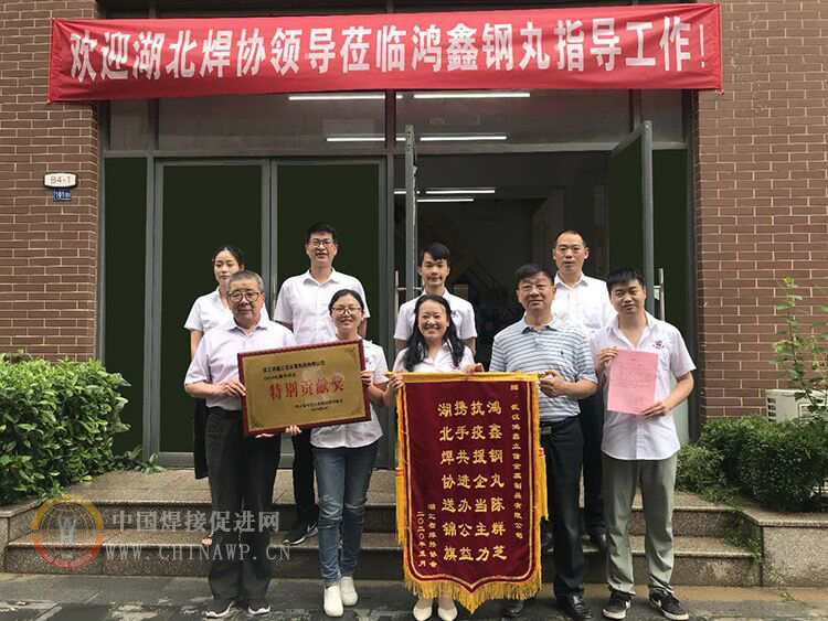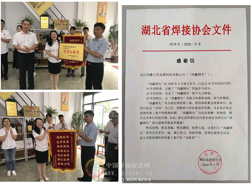活动之六 6月23日,湖北省焊接协会秘书长马才旺等秘书处工作人员专程到武汉鸿鑫立信金属制品有限公司(简称鸿鑫钢丸)进行调研、学习,并代表协会对鸿鑫钢丸在武汉疫情期间所做出的贡献和物资捐赠表示感谢、颁发锦旗和荣誉奖牌。