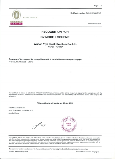 2010年12月18日,武汉一冶钢结构有限责任公司又收到了从美国俄亥俄州寄来的NB证书及印章,这表明,一冶钢构公司自成功取得美国机械工程师协会(ASME,读作阿斯米)认证后,又成功取得了美国国家锅炉压力容器检验师协会(NBBI)认证。按照该认证的许可,在一冶钢构公司根据ASME规范生产的U及U2钢印产品上,可以再敲上美国国家锅炉压力容器检验师协会的NB钢印。
