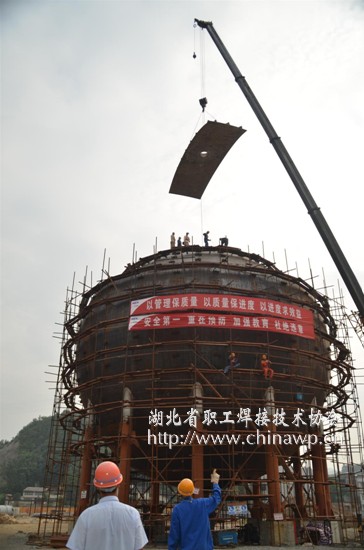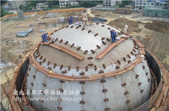 LNG即液化天然气(Liquefied Natural Gas)的简称,为环保气体能源。其主要功能是在用气量较小时将天然气进行液化储备,用气量较大时再转化为气态进入供气管网,化解城市能源使用矛盾。据项目经理周江介绍:湖北利川这台2500立方米LNG双罐不锈钢球罐是重庆民生能源集团“西气东输”中的项目之一,属三类常压容器,直径17米,壁厚20毫米,设计温度-196摄氏度,由62块壳板组成,为双层
