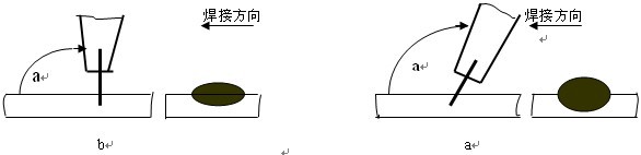 焊缝表面的余高与熔宽与焊枪倾角有着很大的关系,焊枪前倾角越小或垂直于工件(图3a),得到的是窄而高的焊缝;前倾角大得到是平而宽的焊缝(图3b)。